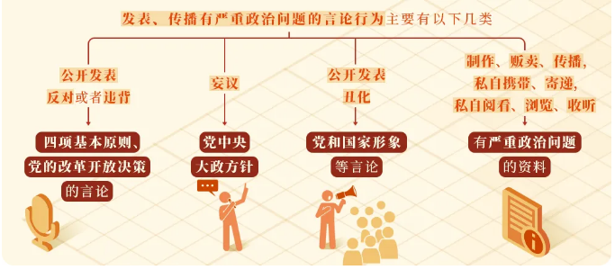 《中国共产党纪律处分条例》第五十条、第五十一条、第五十二条对发表、传播有严重政治问题的言论行为列出负面清单,目的是严格规范党员言论,以严格的纪律处分规定保障四项基本原则、改革开放决策、党中央大政方针贯彻落实,维护党和国家形象,维护党和国家领导人威信,维护英雄模范形象,坚决反对歪曲党的历史、中华人民共和国历史、人民军队历史的行为,维护党的团结和统一。发表、传播有严重政治问题的言论行为主要有以下几类: