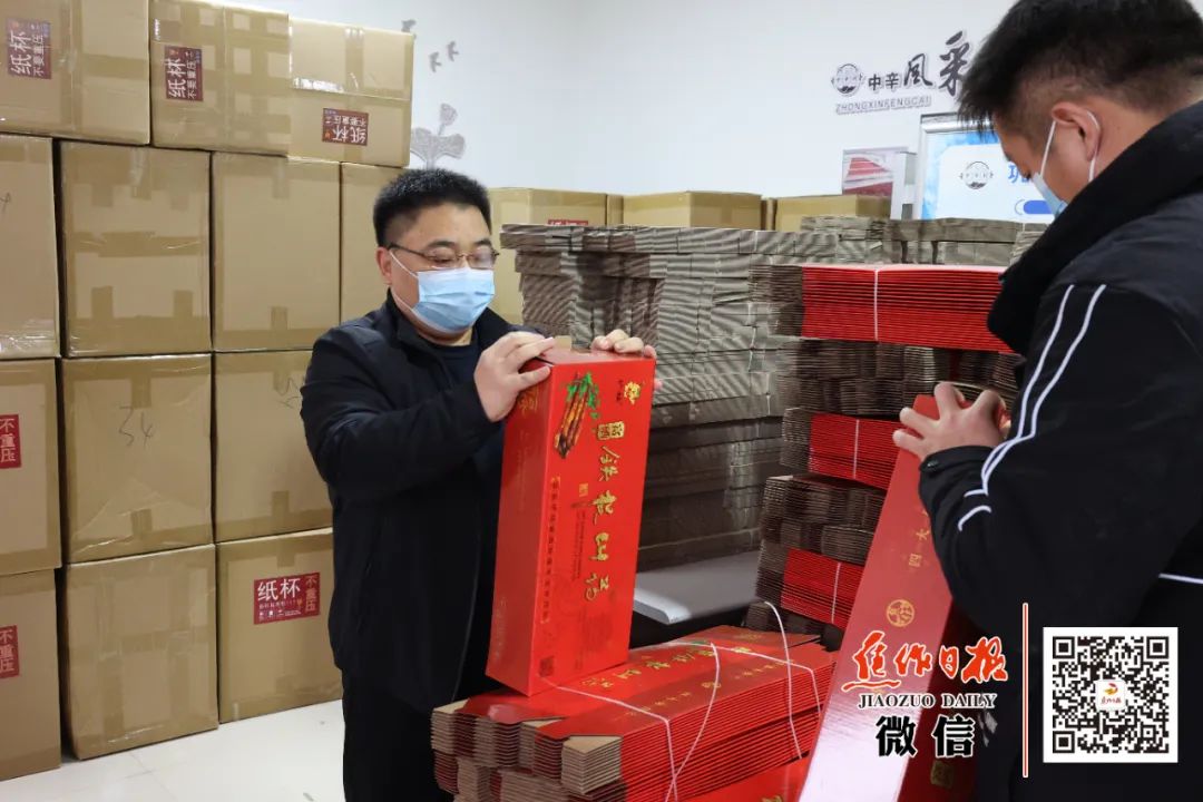 杨延军(左)在帮助村民整理山药包装盒。焦作日报全媒体记者 蒋鑫 摄