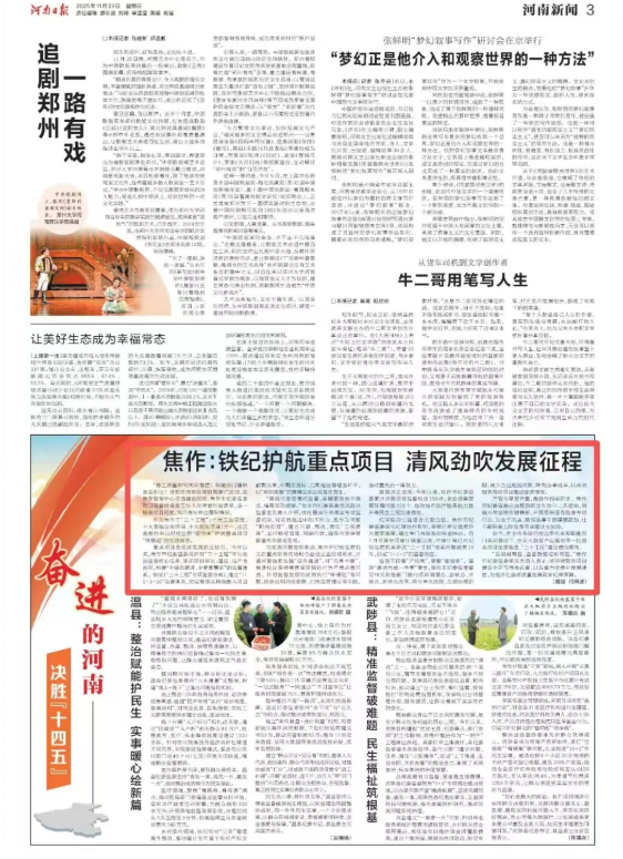 今年是“十四五”规划收官之年,是“十五五”规划谋篇布局之年。11月23日出版的《河南日报》“奋进的河南 决胜‘十四五’”专栏,以《焦作:铁纪护航重点项目 清风劲吹发展征程》为题刊发市纪委监委有关工作做法,全文如下。