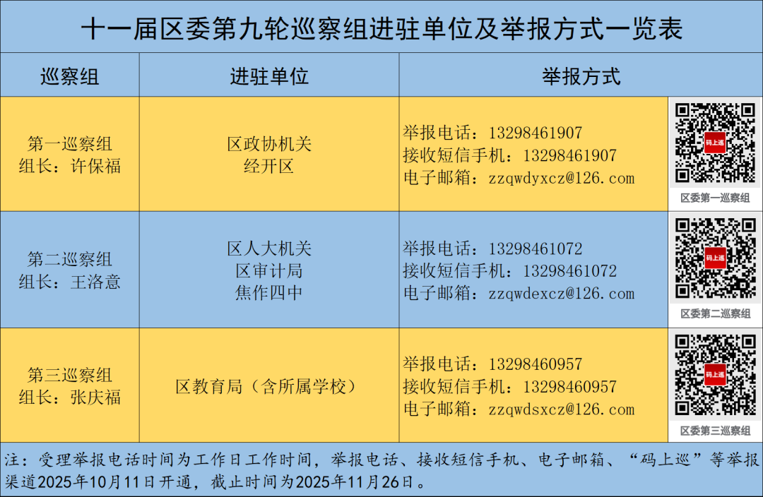 巡察期间,区委各巡察组均开通举报电话、电子邮箱、“码上巡”等信访举报方式,接收群众来电、来信、来访。受理信访举报时间为工作日工作时间,受理信访截止到2025年11月26日。