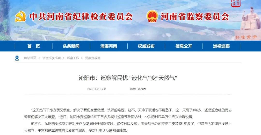 前不久,沁阳市委巡察组在对王召乡龙涧村开展巡察时,多位村民反映:向天然气公司交纳了安装费1年多了,但是至今家里还没通上天然气,平常都是靠进城购买液化气做饭,多次打电话反映都没结果。