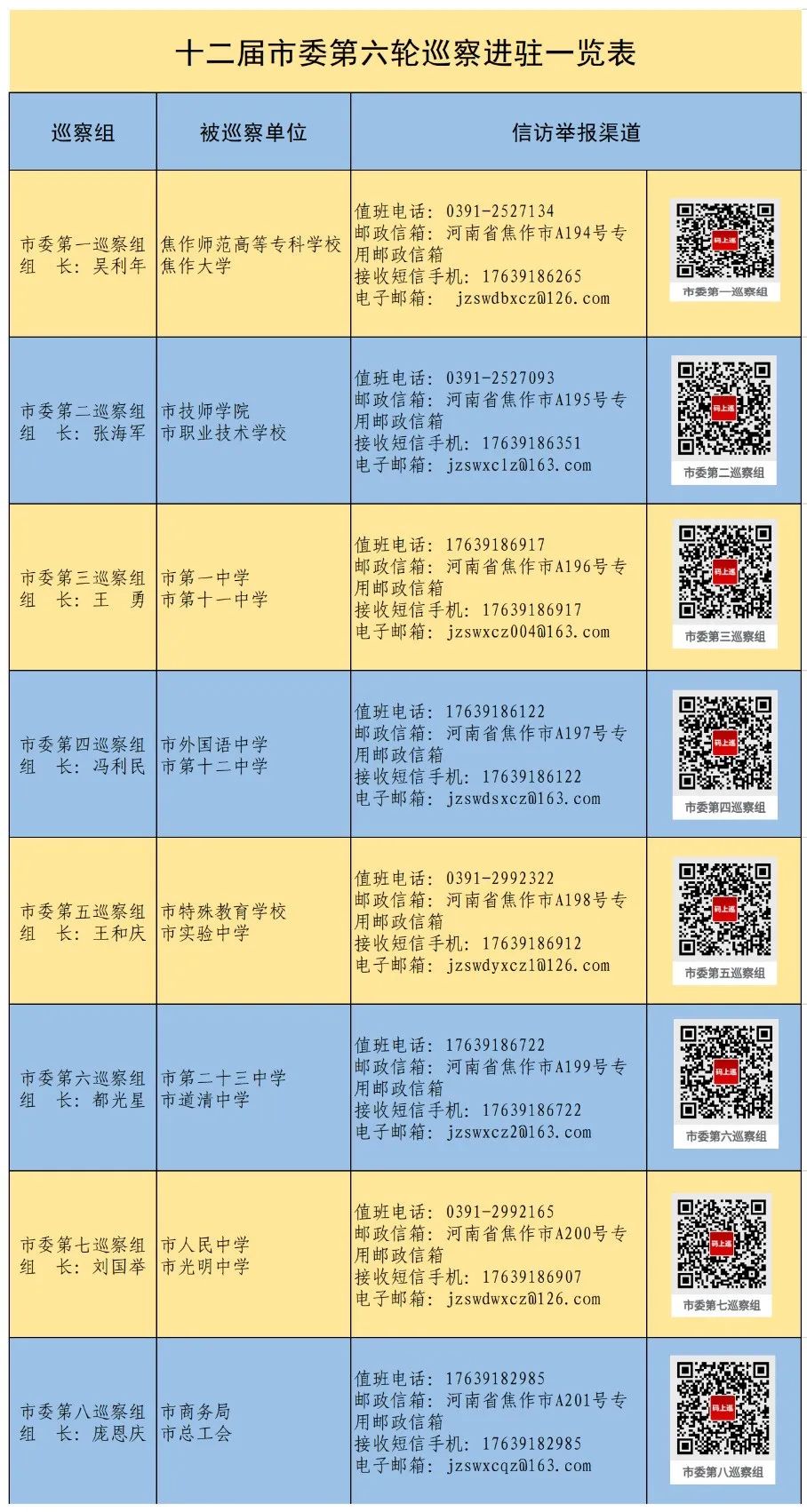 根据市委统一部署,截至8月20日,十二届市委第六轮巡察完成进驻工作。8个巡察组将对焦作师范高等专科学校、焦作大学、市技师学院、市第一中学、市职业技术学校、市第十一中学、市外国语中学、市第十二中学、市实验中学、市人民中学、市第二十三中学、市特殊教育学校、市道清中学、市光明中学、市商务局、市总工会等16家单位开展为期40天左右的常规巡察。