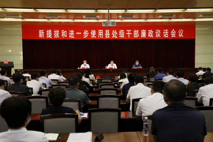 2021年10月以来新提拔使用的近80名县处级领导干部神情严肃、正襟危坐,不时地低头记录着。这场廉政谈话,让参会的党员干部“提神”又“醒脑”。