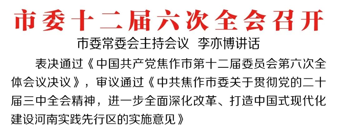 8月30日,中国共产党焦作市第十二届委员会第六次全体会议召开。全会深入学习贯彻党的二十届三中全会、省委十一届七次全会精神,表决通过《中国共产党焦作市第十二届委员会第六次全体会议决议》,审议通过《中共焦作市委关于贯彻党的二十届三中全会精神,进一步全面深化改革、打造中国式现代化建设河南实践先行区的实施意见》。