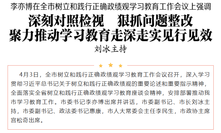 李亦博强调,要持续抓好理论武装,在学深悟透上下功夫。要认真落实“四个深入学习”要求,深刻把握正确政绩观的核心要义、精神实质和实践要求,以上率下抓实专题研讨,分类施策推动全员覆盖,以案为鉴促进学用贯通,在深学细悟中筑牢思想根基,以实际行动坚定拥护“两个确立”、坚决做到“两个维护”。要持续抓好对照检视,在深入查摆上下功夫。要严格遵循“三个对照”要求,对标对表、逐条逐项排查突出问题及具体表现,畅通拓宽群众参与渠道,下沉一线收集意见建议,建立完善常态化查摆机制,动态更新问题清单,确保把问题找全找实找具体,推动查摆工作向深里走、往实里做。要持续抓好靶向施策,在问题整改上下功夫。要坚持边学习、边查摆、边整改,针对查摆出的问题,健全完善立行立改、重点整改、长期整改“三张清单”,逐一明确整改时限、整改措施、整改责任,注重分类施策、举一反三,实行台账式管理、项目化推进,强化跟踪督办与监督问效,以钉钉子精神推动整改工作取得扎实成效。要持续抓好结合融合,在干有所成上下功夫。要坚持把抓好学习教育与推动中心工作紧密结合起来,锚定“两高四着力”,紧扣“1+2+4+N”目标任务体系,以统筹抓好“三十工程”、“345”创新行动、“3+13+N”重点产业链群培育等全市中心工作为抓手,注重在遵循规律中推动高质量发展,在改善民生中加强社会治理,在深化自我革命中推动全面从严治党,以实干实绩检验学习教育成果。要持续抓好督促指导,在常态长效上下功夫。要增强政治自觉,压实责任强化组织领导,精准施策加强分类指导,严肃纪律力戒形式主义,及时总结推进建章立制,切实把学习成果转化为为人民出政绩、以实干出政绩的实际成效,奋力推动焦作“十五五”开好局起好步。