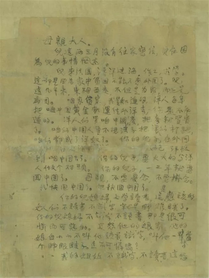 谁不思念自己的家乡,谁不挂念自己的亲人?1922年,杨介人在给母亲的一封家书中道出了异国求学的初心:“儿来法国漂洋过海,做工求学,这都是因为家中贫困不能不来外国了。儿这几年来,东跑西走,不但是为家,而更是为国……”