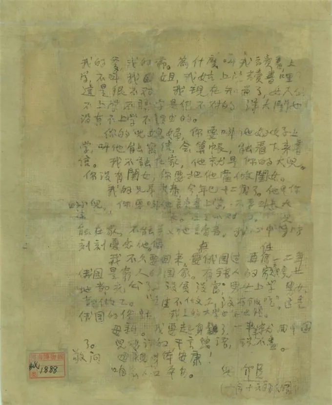 在这封家书中,杨介人向母亲讲述了洋人侵华的罪行:“咱们中国人要不想法子把洋人们打跑,咱们就成了洋奴了。你的儿子在外国,亲眼看见洋人戴着钢盔、刺刀、大炮、洋枪到咱中国去了,你的儿子要大大的与洋人作个对头……”列强入侵、清政府腐败无能、军阀混战、百姓民不聊生,目睹这些现状的杨介人远赴万里,为的就是救国救民。