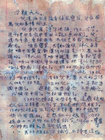 谁不思念自己的家乡,谁不挂念自己的亲人?1922年,杨介人在给母亲的一封家书中道出了异国求学的初心:“儿来法国漂洋过海,做工求学,这都是因为家中贫困不能不来外国了。儿这几年来,东跑西走,不但是为家,而更是为国……”