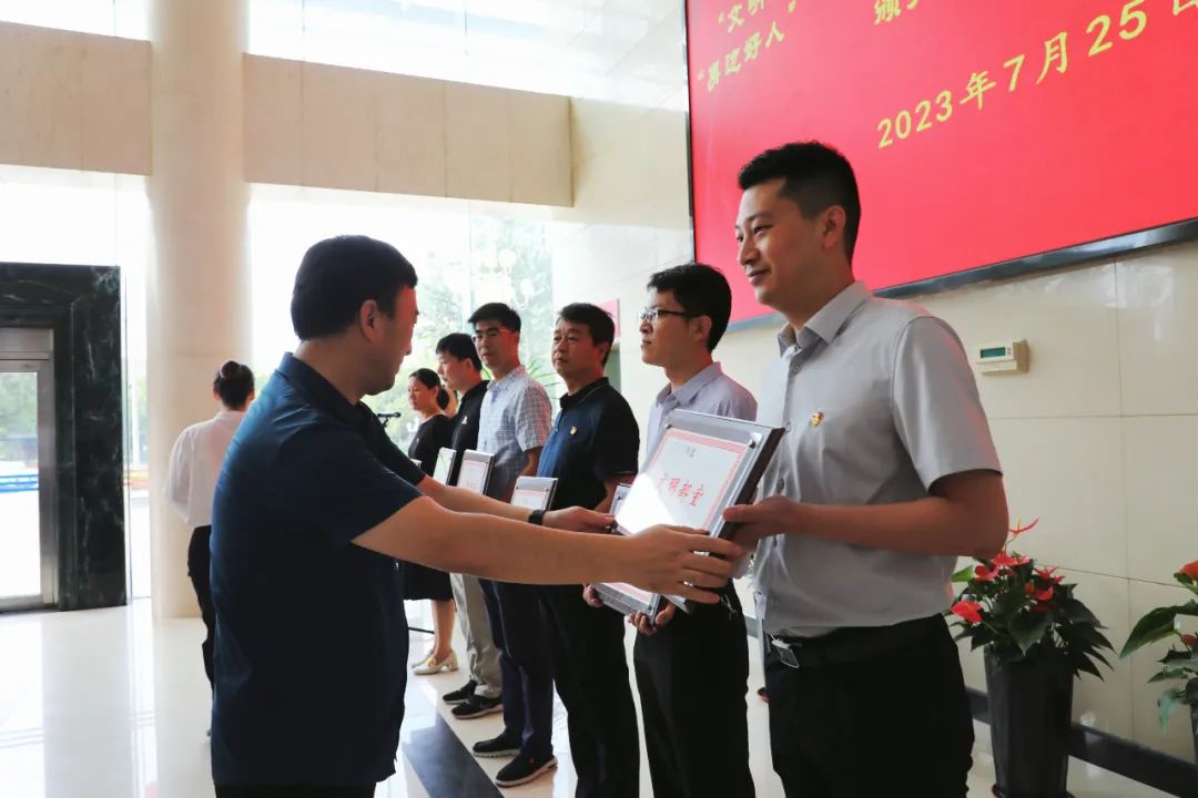 仪式首先宣读了《关于表扬2023年度“文明部室(纪检监察组)”“文明家庭”“身边好人”的决定》和《中共焦作市纪委监委机关委员会关于表扬2023年上半年度“先锋党支部旗帜”“党员先锋岗”的决定》,市纪委监委机关5个党支部和10名党员分别荣获2023年上半年“先锋党支部旗帜”和“党员先锋岗”,6个部室和4个纪检监察组荣获2023年度“文明部室(纪检监察组)”,5名同志荣获“文明家庭”,3名同志获得“身边好人”荣誉称号。